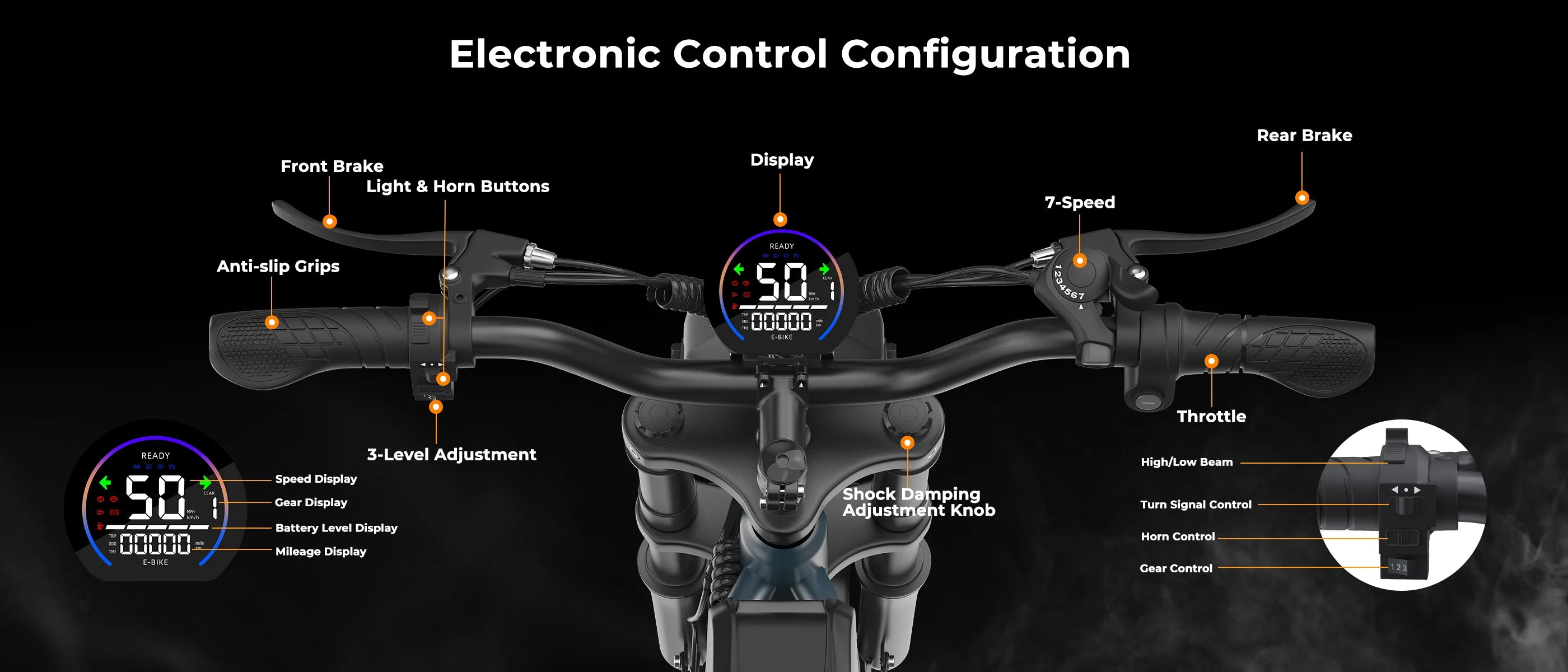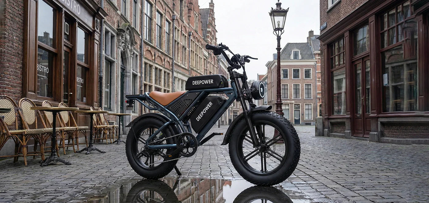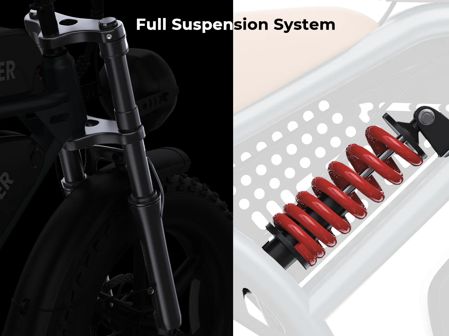Deepower’s 20"x4" Sunrise puncture-resistant wide tires (deep tread for soft/slippery grip) and front suspension handle flat roads, mountain trails, snow, and gravel with ease—absorbing bumps to deliver a stable, worry-free ride anywhere.