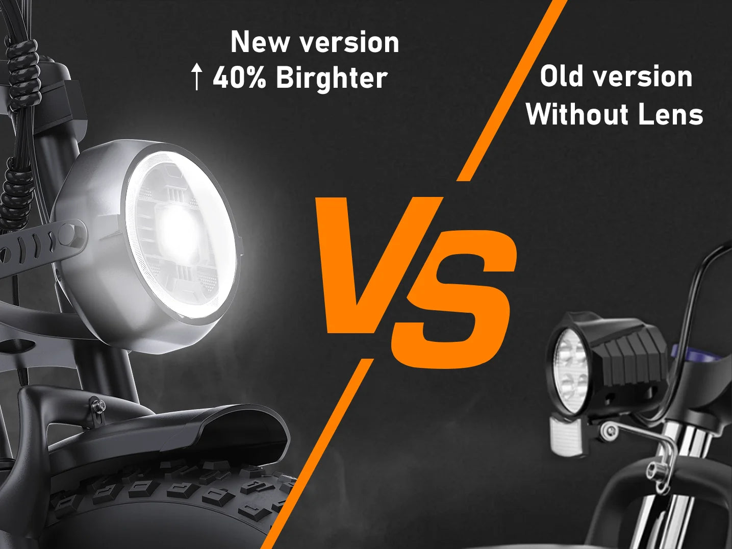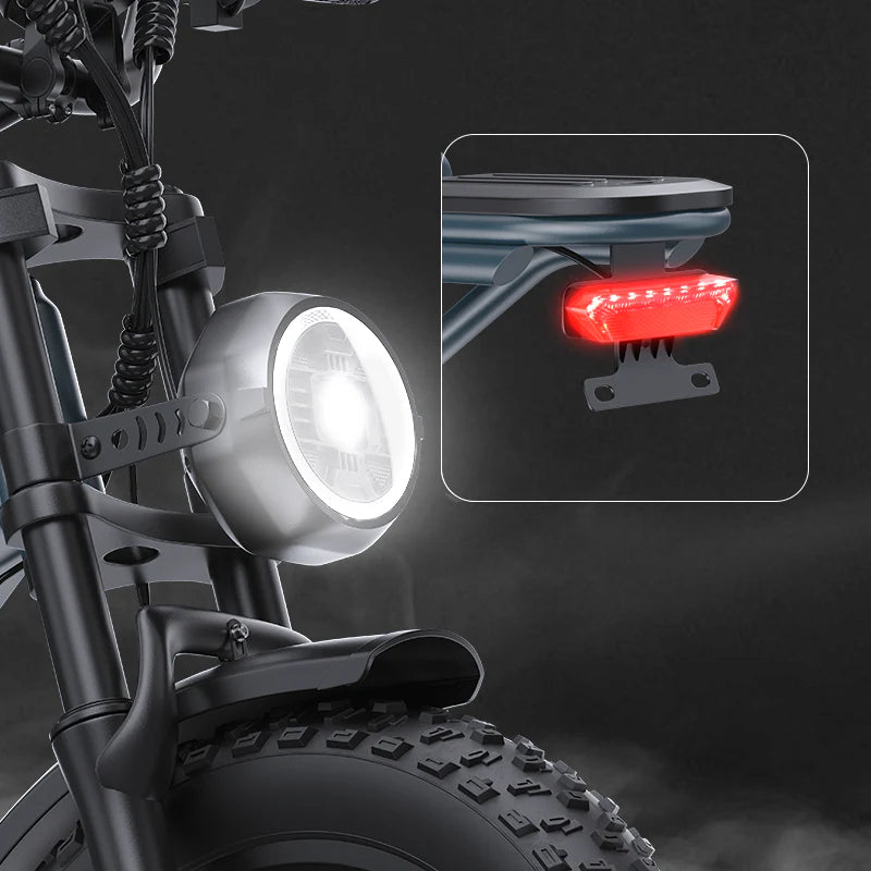 High-power LED headlights (30% brighter, 100ft/30m beam) with horn; red emergency taillights (with turn signals) flash on brake for maximum safety.